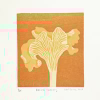 4-color reduction woodcut print, on warm white cotton text. Printed from one block, this print has 4 layers of color to bring the delicate Chanterelle mushroom to life. It's one of our favorite wild edible mushrooms, and is represented in soft, warm yellow tones with a warm rust-orange background. The print measures approximately 3.25x3.5" on 8x10 paper. Signed and numbered in an edition of 25.