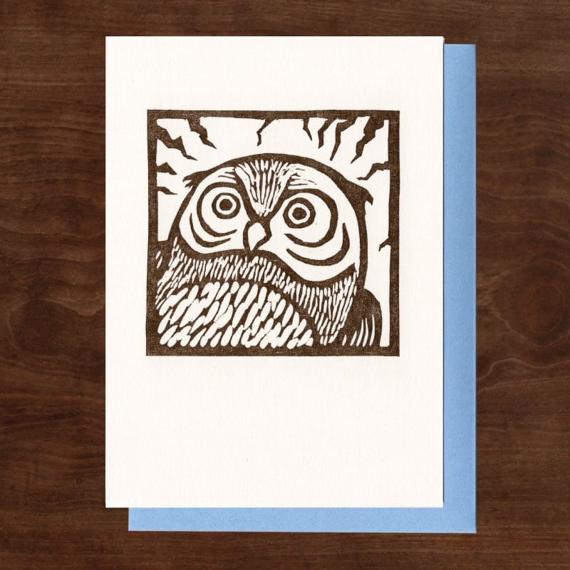 Letterpress printed notecards, featuring a woodcut of an intense owl. Printed in rich brown ink on recycled paper, with medium blue envelopes. 4bar size (3.5x5), set of 6 cards packaged in a kraft box.